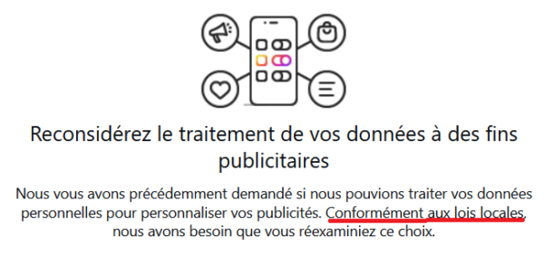 Et l’indice, tout petit indice je l’admet, mais indice quand même, de la suffisance des GAFAM, il git dans leur vocabulaire. Ils auraient pu dire « Conformément à la loi française », ou encore, si par flemme ils voulaient rédiger un texte utilisable tel quel dans tous les pays francophones « Conformément à la loi de votre pays ». Mais non : notre minable, négligeable « loi locale », est pour eux une survivance (en voie de disparition face à leur illibéralisme en marche) de notre croyance débile qu’elle peut encore s’opposer à leur impérialisme universel…
